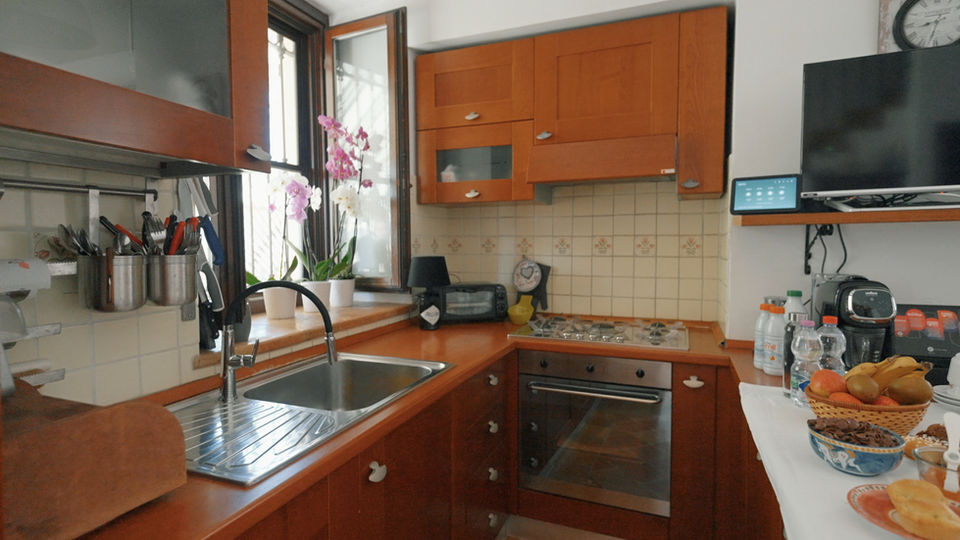 Lower floor: You will find a modern and fully equipped kitchen, equipped with everything you need to prepare delicious meals: refrigerator, gas stove, air conditioning and, why not, also a fridge stocked with fresh drinks, including craft beer produced by our manager , Andrew.